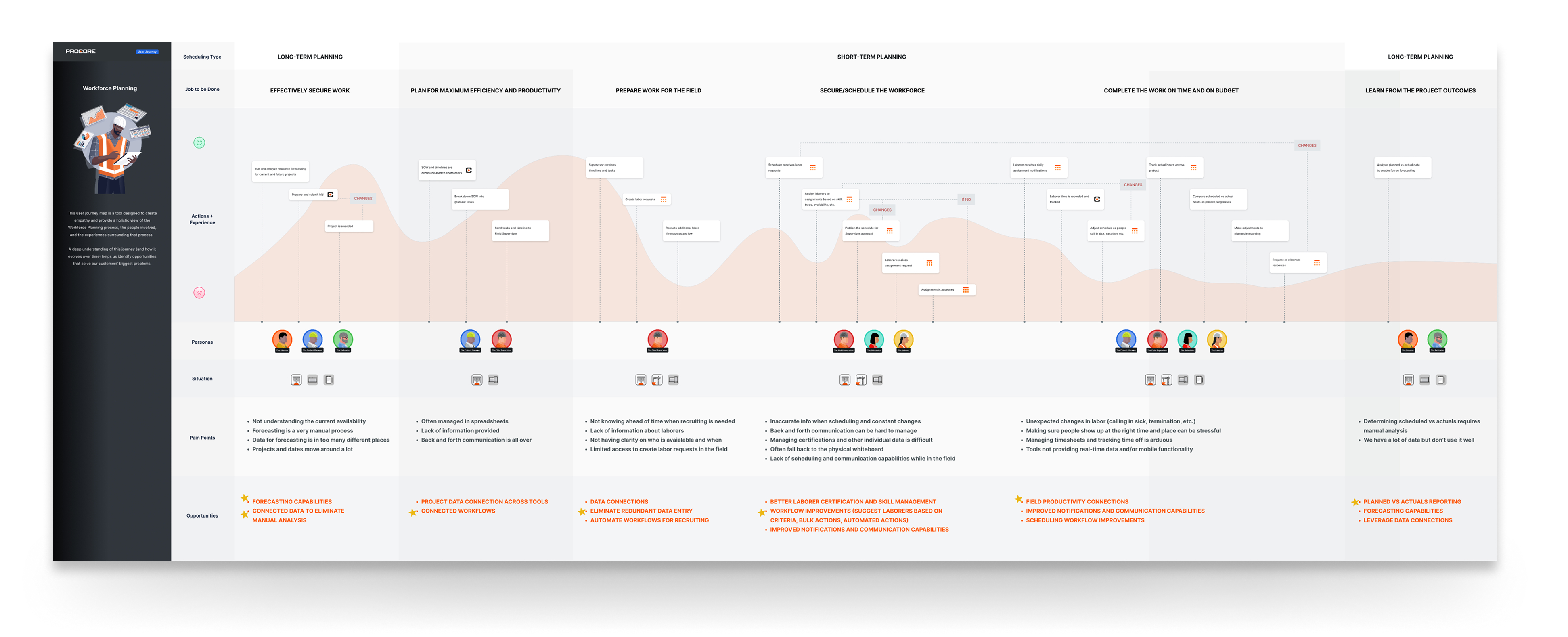 User journey map depicting a holistic view of the workforce scheduling process, the people involved, and the experiences surrounding that process.